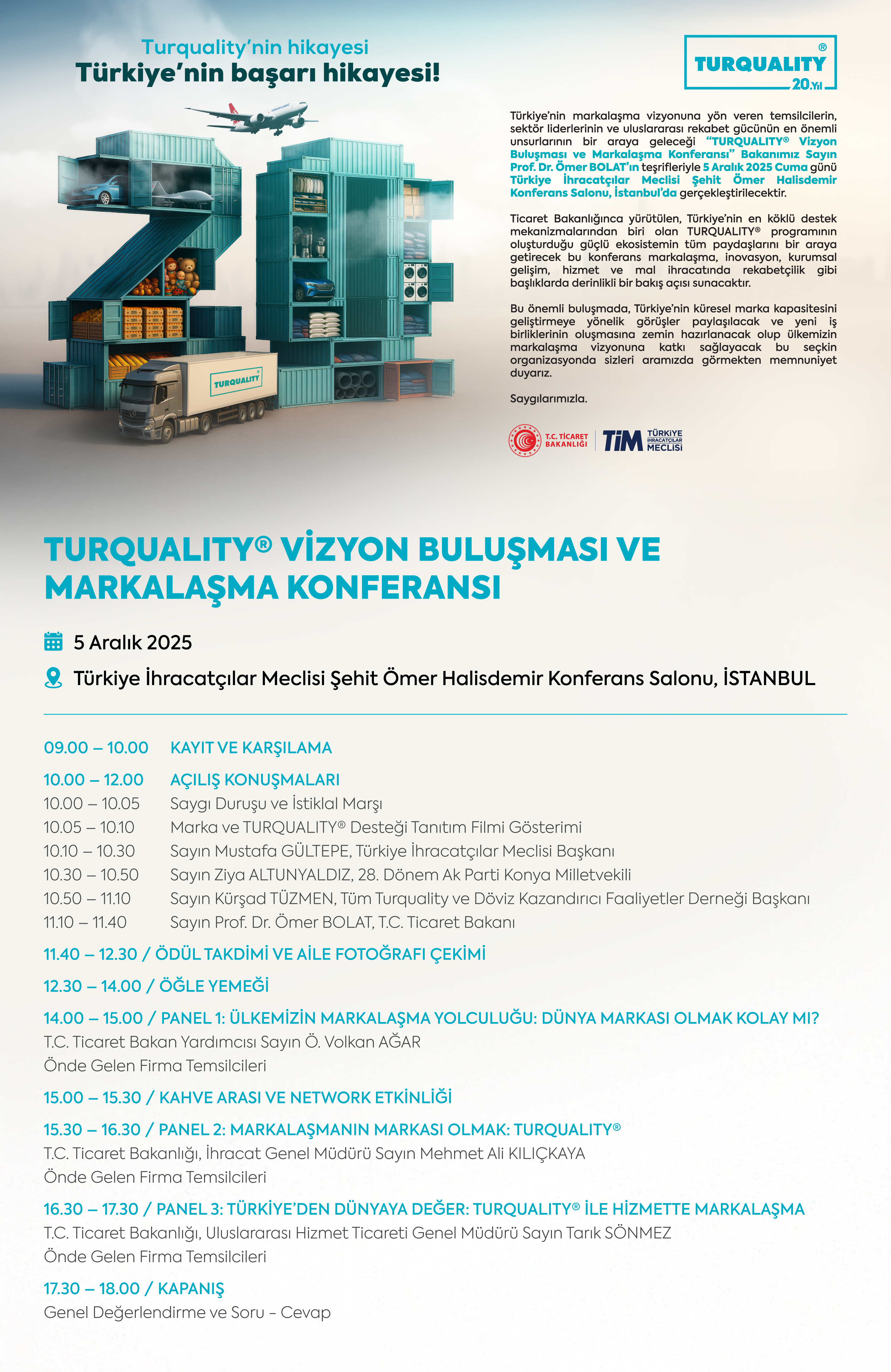 Türkiye'nin markalaşma vizyonunu şekillendiren politika araçlarının, sektör temsilcilerinin ve küresel rekabet gücünü artıran paydaşların bir araya geleceği TURQUALITY® Vizyon Buluşması ve Markalaşma Konferansı, Ticaret Bakanı Sayın Prof. Dr. Ömer BOLAT'ın teşrifleriyle 5 Aralık 2025 tarihinde Türkiye İhracatçılar Meclisi Şehit Ömer Halisdemir Konferans Salonu'nda (İstanbul) gerçekleştirilecektir.